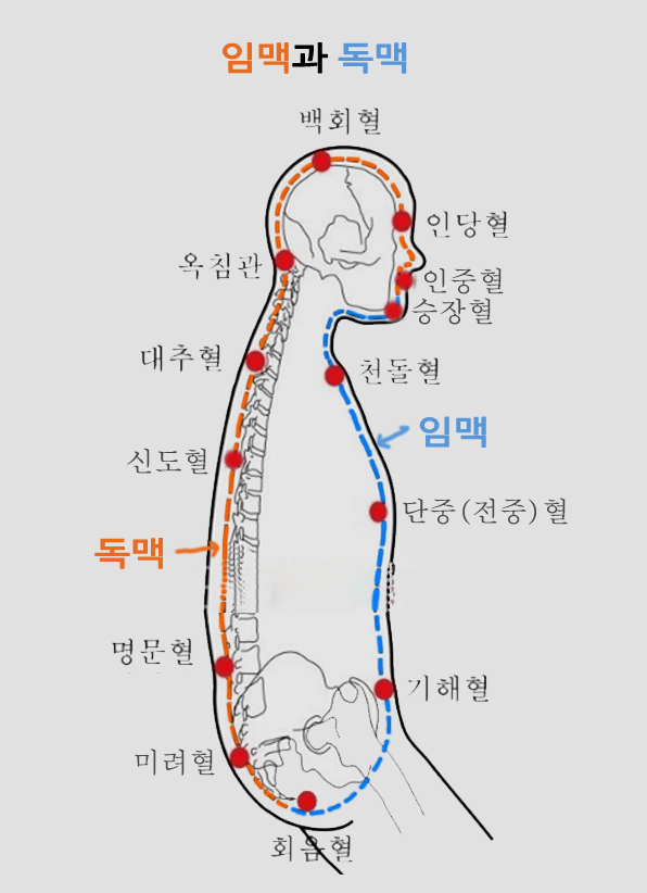 임맥의 주요 혈 자리는 회음, 기해, 단중, 천돌, 승장이고, 독맥은 회음에서 시작해 미려, 명문, 신도, 대추, 옥침, 백회, 인당, 인중, 승장, 백회로 이어집니다. 기회가 되면 임맥과 독맥 혈 자리에 대해서 심도 있게 다뤄보도록 하겠습니다.