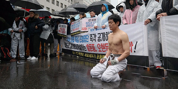 또 한 국내에서는 공조직인 ‘경기도협회’에서 공공연하게 단증매매를 해 태권도인들을 경악하게하며 단증의 권위를 송두리째 흔들어 버리는 등 태권도 수련가치를 최악으로 몰고 가더니, 이번에는 그나마 지켜지고 있는 수련의 가치를 지킬 수 있는 마지막 보류인 국기원 공인 승품.단 심사(1~4단)를 비록 한시적이지만 일선도장에서 실시한다는 정책적 결정을 공론화 과정도 없이 일방적으로 선언해 버린 국기원이 도대체 태권도의 중앙도장이 맞는지 묻지 않을 수 없습니다.